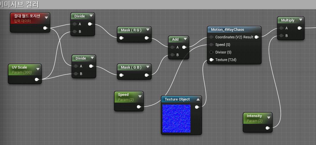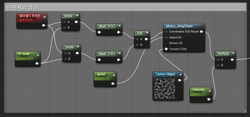 참조 영상:https://www.youtube.com/watch?v=BRi4KrGCS80 UV Scale / Speed / Intersity = Scalar Parameter 월드 좌표로부터 UV를 나눠, R,G 값과 G B값을 더한다. Motion_4WayChaos 4WayChaos는 더블클릭해보..