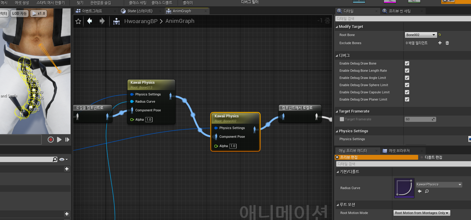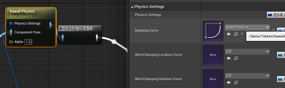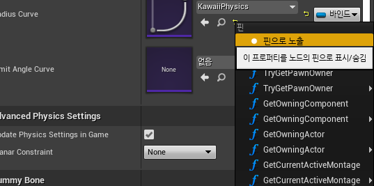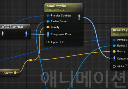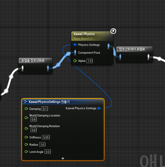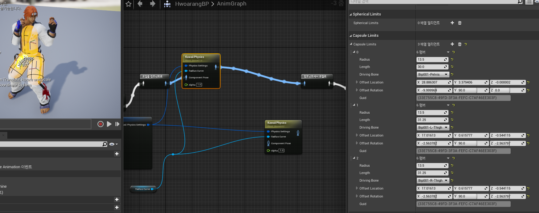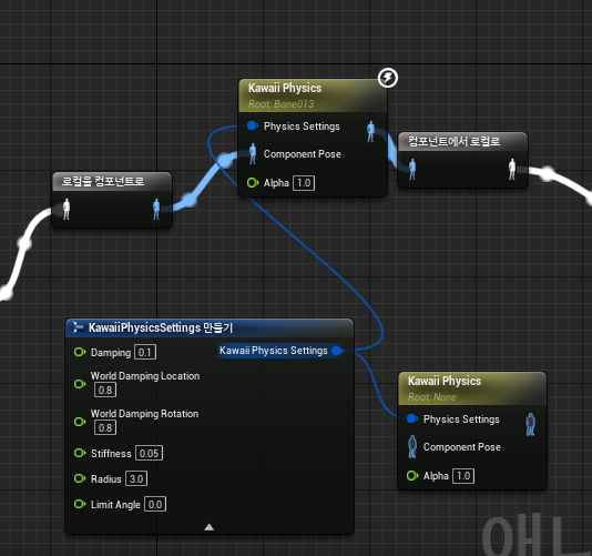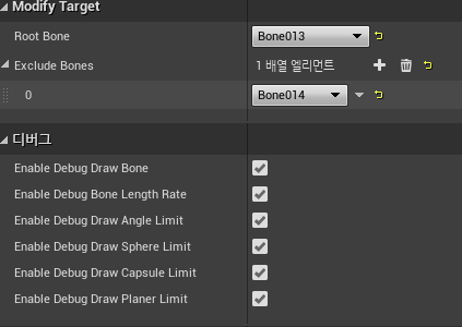 Exclude Bones를 적용시키면, 해당 하위노드부터는 카와이피직스의 영향을 받지않는다.